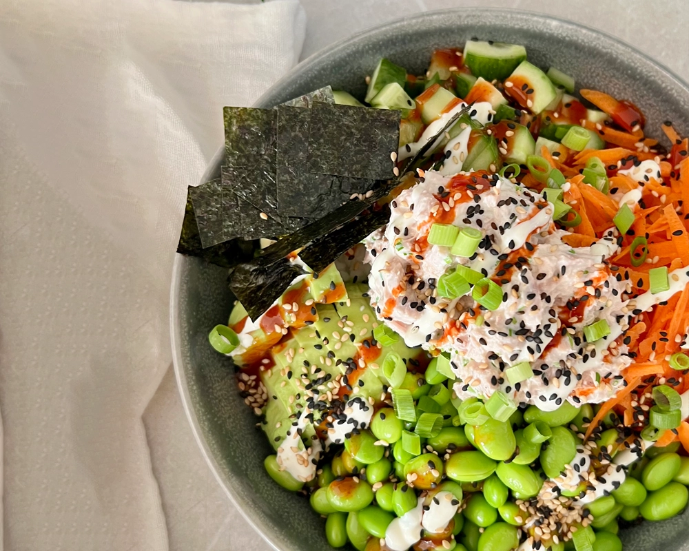 - Pynt med dressing, sriracha, ristet sesam og forårsløg.